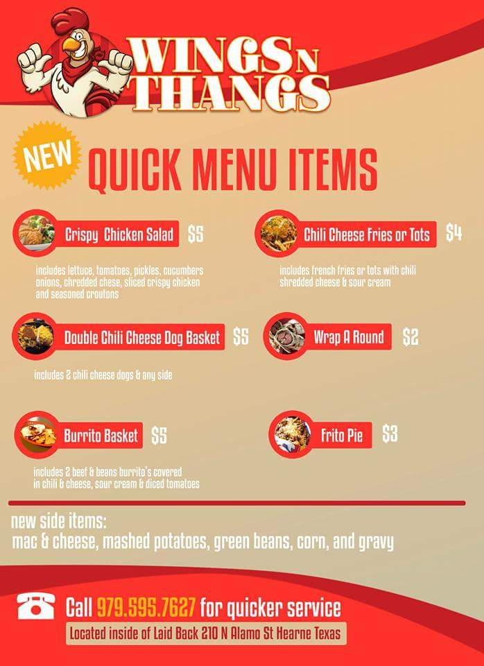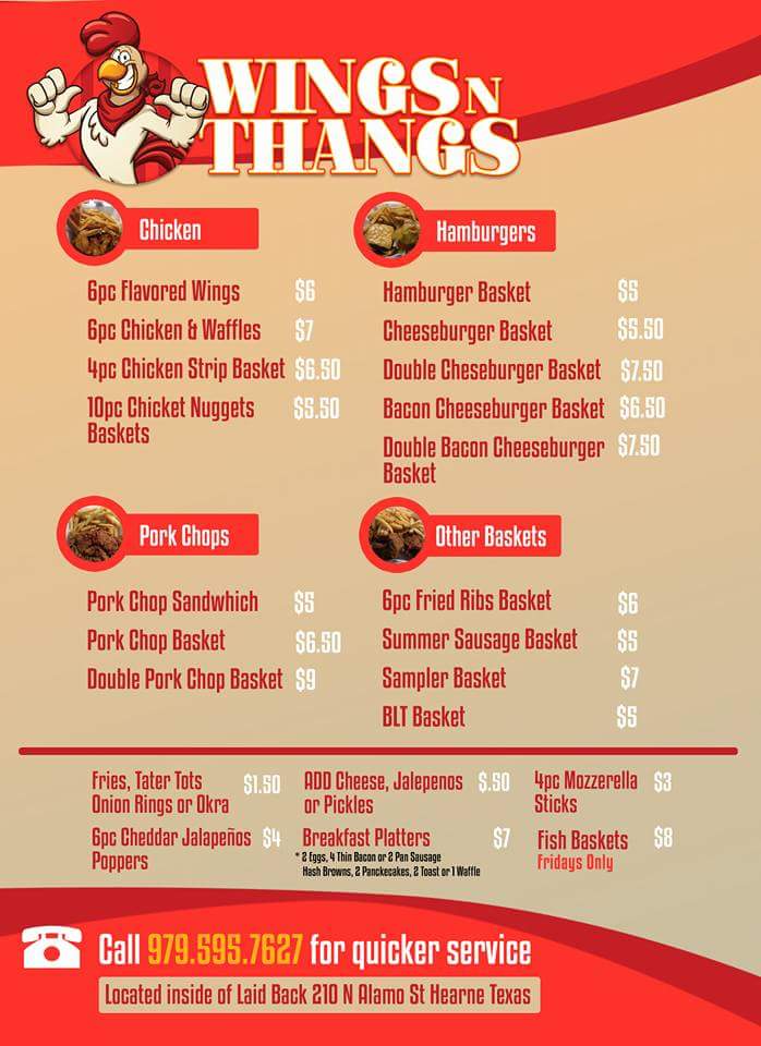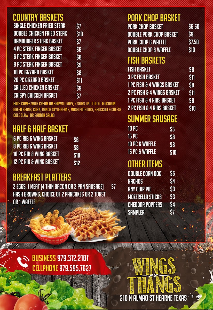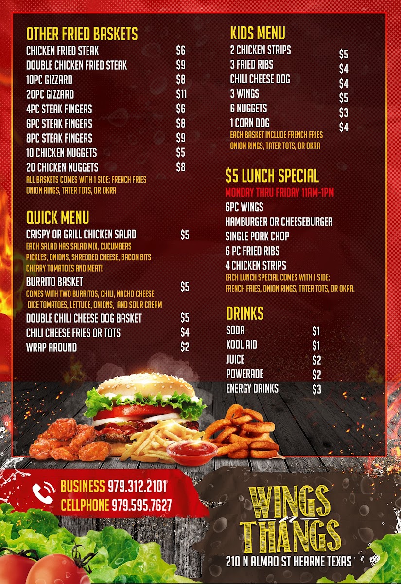 Welcome to Wings N Thangs, a culinary gem located at 210 N Alamo St, Hearne, TX. This restaurant is a must-visit for wing enthusiasts and comfort food lovers alike. The extensive menu boasts enticing selections, including expertly seasoned chicken wings, pork chop baskets, and hearty steak fingers.
